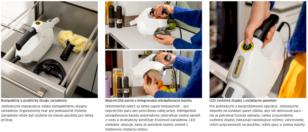 Kompaktný ručný parný čistič SC 1 Multi čistí bez chemikálií a je pripravený na hĺbkové čistenie v záblesku. Dôkladné čistenie odstraňuje až 99,999% vírusov1) a 99,99% všetkých bežných domácich baktérií2) z tvrdých povrchov. Kompaktný a praktický dizajn zariadenia umožňuje pohodlné používanie a jednoduché skladovanie v najmenších priestoroch. Model SC 1 Multi je pripravený na použitie za 30 sekúnd a vďaka odnímateľnej nádrži na vodu sa ľahko dopĺňa – pre dlhšie intervaly údržby a menej prerušení. Vymeniteľná odvápňovacia náplň zabezpečuje automatické odvápňovanie počas životnosti výrobku, ktorá je päťkrát dlhšia. LED svetelný displej s ovládacím panelom umožňuje jednoduchú a bezproblémovú prevádzku. Rôzne režimy, ako je zahrievanie, ready-to-upe, režim pary a výmena náplní, sú vždy vystavené. K dispozícii je tiež možnosť rozšíriť sa na inovatívny multifunkčný parný mop 4 v 1.