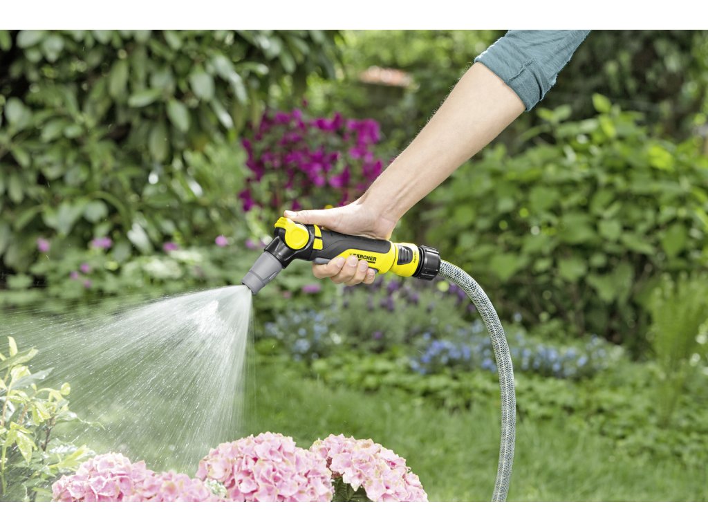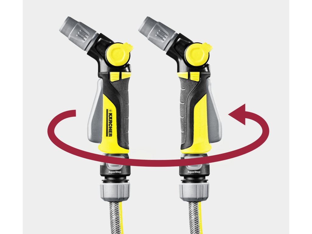Toľko komfortu ponúka iba Kärcher: Otočná rukoväť, pomocou ktorej sa dá aretovateľná spúšť nasmerovať dopredu alebo dozadu, umožňuje individuálne používanie striekacej pištole. Navyše sa skladá z príjemných prvkov z mäkčeného plastu, ktoré ponúkajú dodatočnú ochranu. Jednoručne ovládateľný regulačný ventil okrem toho umožňuje prispôsobovanie prietoku podľa potreby. Striekacia pištoľ Plus má dva tvary rozstrekovaného prúdu: bodový a kužeľový prúd. Nastavujú sa plynulo v závislosti od potreby – napríklad na zavlažovanie kvetinových a rastlinných záhonov alebo na odstraňovanie hrubej špiny z terasy alebo záhradného nábytku. Mimochodom: Postrekovače Kärcher sú kompatibilné s všetkými dostupnými klik systémami a dajú sa ľahko napojiť na záhradnú hadicu.Dodatočné parametre