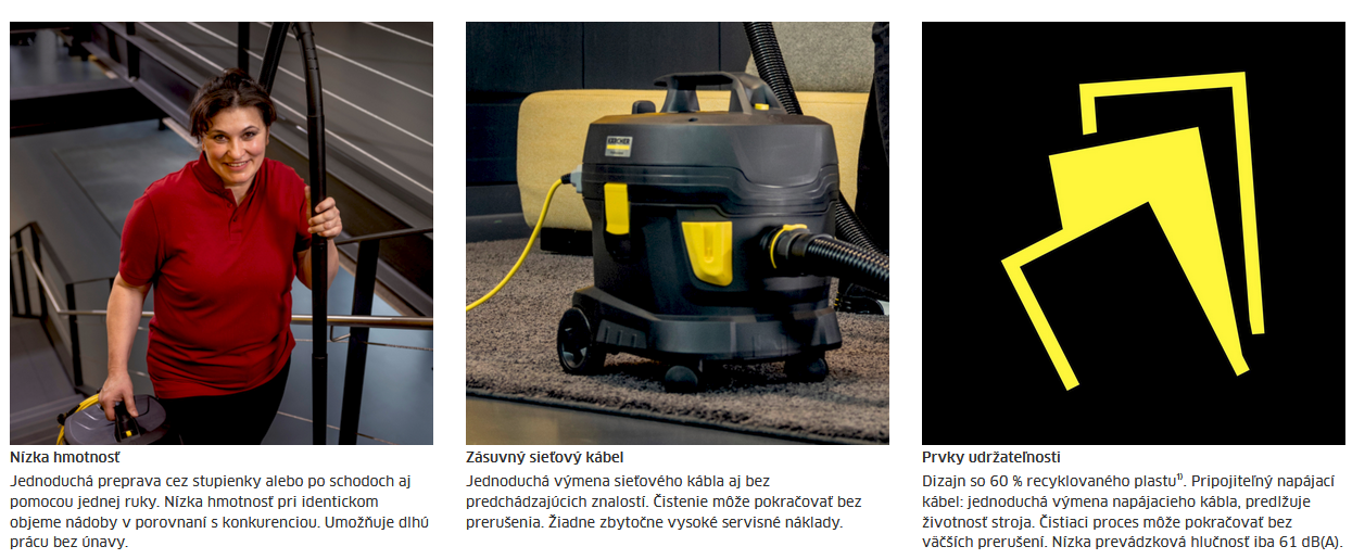 Limitovaná edícia čierneho suchého vysávača T 11/1 Classic Adv Go!Further, vyrobeného zo 60 percent recyklovaného plastu, sa dodáva s exkluzívnym príslušenstvom a 10 flísovými filtračnými vreckami. Vysávač presvedčí prvotriednym sacím výkonom, vysokou robustnosťou a atraktívnym pomerom ceny a výkonu. Vďaka 60-percentnému podielu recyklovaného materiálu sa hneď od začiatku šetria zdroje a znižuje sa spotreba energie. Napriek silnému saciemu výkonu zostáva stroj s hlučnosťou iba 61 dB(A) príjemne tichý, čo umožňuje jeho použitie aj v miestach citlivých na hluk. Kompaktný a stabilný vysávač má objem zásobníka 11 litrov a váži iba 4 kilogramy. Ergonomická rukoväť na prenášanie a integrované koleno umožňujú dlhú prácu bez únavy a pohodlnú prepravu. 12 metrov dlhý zásuvný napájací kábel môže používateľ kedykoľvek jednoducho vymeniť. Na samotnom vysávači sa nachádza špeciálne úložné zariadenie na príslušenstvo, ako je sacia trubica a podlahová hubica.