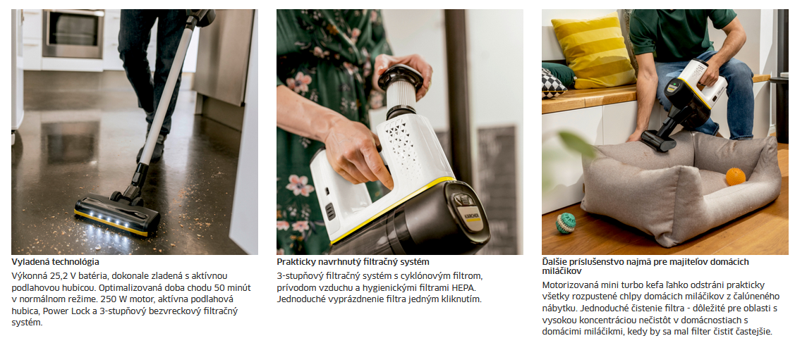 Akumulátorový vysávač VC 6 ourFamily Pet zaujme vynikajúcimi výsledkami, pohodlnou manipuláciou a maximálnou voľnosťou pohybu pri prevádzkovej dobe až 50 minút. Výkonný 250-wattový BLDC motor zaisťuje bez námahy vysávanie a dôkladné výsledky čistenia, aj keď je potrebné odstrániť chlpy domácich miláčikov a odumreté kožné bunky. Má tiež funkciu Boost pre extra výkon, keď je to potrebné. Motorizovaná podlahová hubica s LED svetlom čistí tvrdé podlahy aj koberce. K dispozícii je tiež motorizovaná mini turbo kefa na čalúnený nábytok a matrace. Pre väčšie pohodlie má vyprázdnenie nádoby na prach len 1 kliknutím, ergonomický dizajn pre ľahký prístup pod nábytok a trojúrovňový indikátor batérie. Ďalšou výhodou je tichý prevádzkový hluk pri vysávaní, ktorý nevystraší domáce zvieratá. Tlačidlo uzamknutia odstraňuje potrebu neustáleho podržania tlačidla napájania. Kompaktné zariadenie je možné použiť aj ako ručný vysávač, napríklad na čistenie nábytku. Rozsah balenia zahŕňa štrbinovú hubicu, mäkkú nábytkovú kefu 2 v 1, nástroj na čistenie filtra, ako aj druhý náhradný filter a nástenný držiak s funkciou nabíjania.
