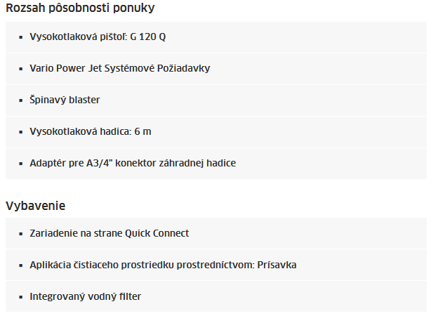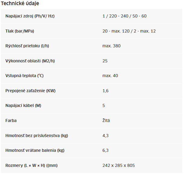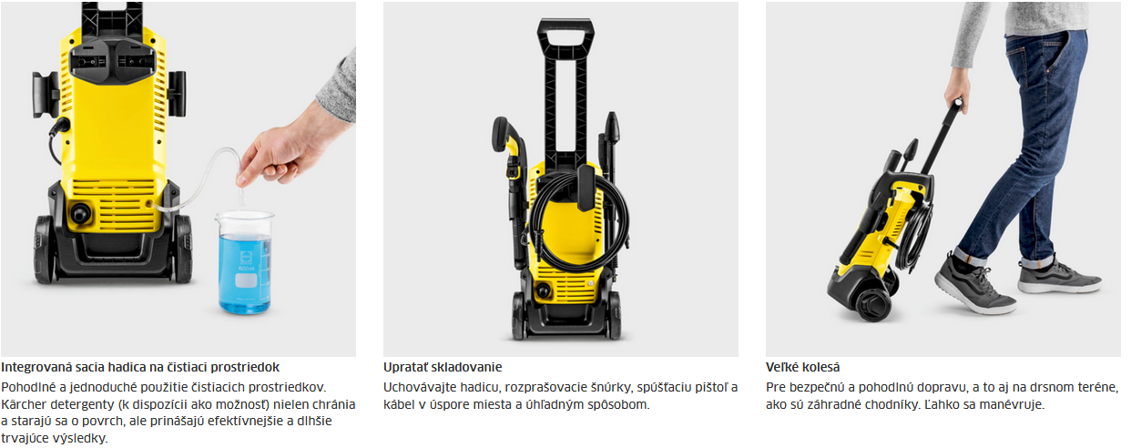 S tlakovým čističom K 3 je špina minulosťou. Vďaka 6 metrov dlhej vysokotlakovej hadici je čistič ideálny na občasné použitie v domácnosti a dodáva trblietavý lesk malým záhradným plochám a terasám, ako aj záhradnému nábytku a autám. Vďaka rozprašovacej tryske Vario Power (VPS) sa tlak vody dá ľahko nastaviť podľa povrchu jednoduchým otočením. Rotačná tryska s rotačným bodovým prúdom uvoľní aj tie najodolnejšie nečistoty a čerpadlo je chránené vodným filtrom – pre dlhú životnosť. Hladko bežiace kolieska uľahčujú prepravu tlakového čističa K 3 tam, kam je potrebný.