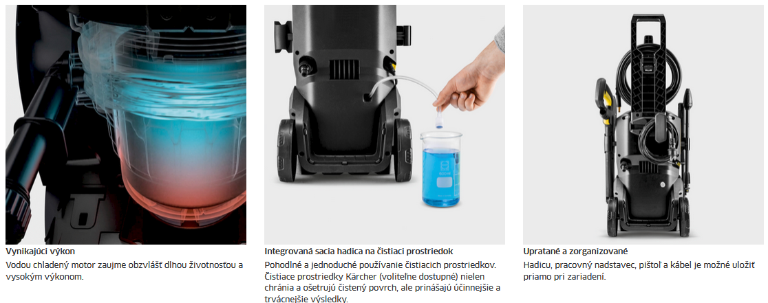 Vysokotlakový čistič K 4 zaujme výkonným vodou chladeným motorom, ktorý sa vyznačuje dlhou životnosťou. Vysokotlakový čistič so 6 metrov dlhou vysokotlakovou hadicou bol skonštruovaný na príležitostné použitie a mierne znečistenie. Vďaka pracovnému nadstavcu Vario Power (VPS) a rotačnej tryske je možné podľa potreby čistiť terasy, záhradný nábytok a vozidlá. Tlak vody je možné presne prispôsobiť konkrétnemu predmetu, ktorý sa má čistiť, jednoduchým otočením VPS. Rotačná tryska s rotujúcim bodovým prúdom navyše zaisťuje úspešné čistenie bez akýchkoľvek kompromisov aj pri odolných nečistotách. Všetko príslušenstvo je možné uložiť priamo pri zariadení. Zabudovaný vodný filter spoľahlivo chráni čerpadlo pred časticami nečistôt.