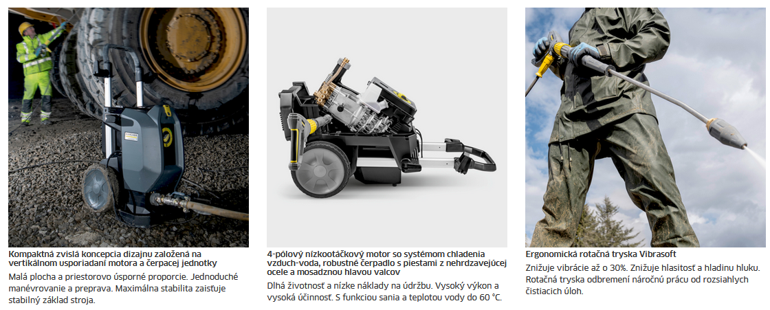 Studenovodný vysokotlakový čistič HD 10/25-4 S Plus je ideálny stroj pre ergonomickú a užívateľsky prívetivú obsluhu. EASY! Force Advanced vysokotlaková pištoľ umožňuje pohodlné používanie bez akejkoľvek prídržnej sily. Tlak a objem vody je možné nastaviť pomocou servoregulátora umiestneného medzi pracovným nadstavcom a spúšťovou pištoľou. Znížením tlaku týmto spôsobom môžu používatelia rýchlo reagovať na citlivé povrchy – bez toho, aby museli meniť celú trysku. Rotačná tryska Vibrasoft tiež výrazne znižuje vibrácie na pracovnom nadstavci. Asistenčné systémy a LED stavový displej zvyšujú užívateľskú prívetivosť. Starostlivo vybrané materiály zaisťujú, že špičková kvalita pokračuje aj vo vnútri stroja Super Class. Odolné axiálne čerpadlo, piesty z nehrdzavejúcej ocele a mosadzná hlava valcov spolupracujú so 4-pólovým nízkootáčkovým motorom so systémom chladenia vzduch-voda. Integrované nosiče rámov vyrobené z hliníka tvoria ľahký, ale robustný podvozok, vďaka čomu je nakladanie žeriava voliteľné. Pre kompaktnú a prenosnú konštrukciu je motorová a čerpacia jednotka namontovaná vertikálne vo zvislom usporiadaní. Stroj je vybavený aj úložným priestorom na príslušenstvo.