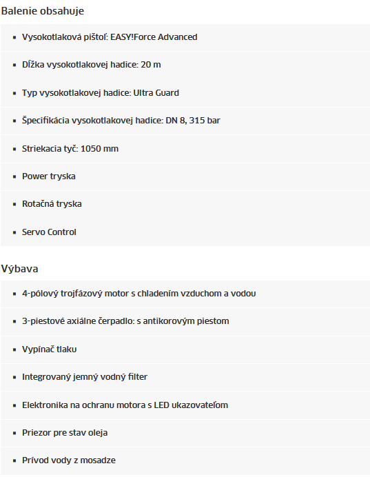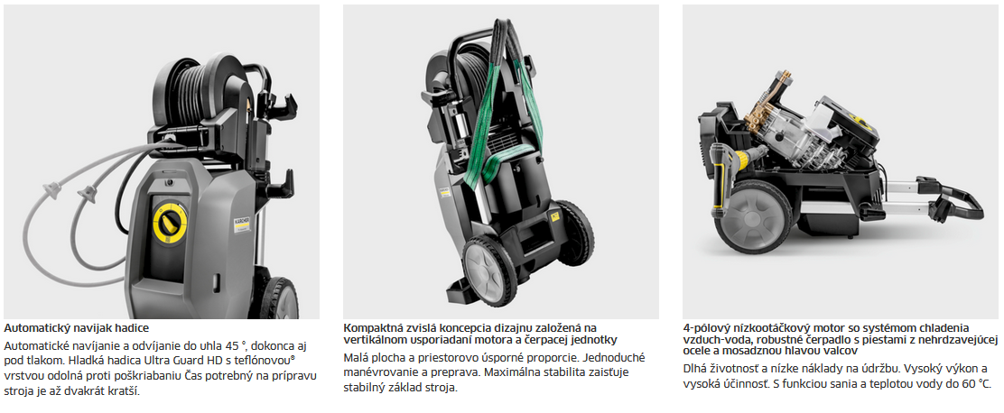 Studenovodný vysokotlakový čistič HD 10/25-4 SXA Plus je navrhnutý s ohľadom na najlepšiu kvalitu a ergonómiu. JEDNODUCHÉ! EASY! Force Advanced vysokotlaková pištoľ likviduje akékoľvek prídržné sily. Tlak a objem vody je možné nastaviť pomocou servoregulátora umiestneného medzi pracovným nadstavcom a spúšťovou pištoľou. To znamená, že tlak je možné nastaviť tak, aby vyhovoval jemným povrchom – bez toho, aby ste museli meniť trysku alebo upravovať samotný stroj. Rotačná tryska Vibrasoft tlmí hluk a vibrácie. Asistenčné systémy a LED stavový displej poskytujú jasné informácie. Stroj Super Class vyčnieva z davu pre svoje vynikajúce spracovanie a najkvalitnejšie materiály. Jeho srdcom je odolné kolísavé čerpadlo s piestami z nehrdzavejúcej ocele a mosadznou hlavou valcov. 4-pólový nízkootáčkový motor so systémom chladenia vzduch-voda je výkonný a vyrobený tak, aby vydržal. Integrované hliníkové nosiče rámu tvoria ľahký podvozok vhodný na nakladanie žeriavom. Zvislý konštrukčný štýl s vertikálnym motorom a čerpacou jednotkou udržuje stroj kompaktný a prenosný. Je tiež vybavený vysokotlakovou hadicou Ultra Guard s teflónovou® vrstvou a dostatočným vstavaným úložným priestorom.